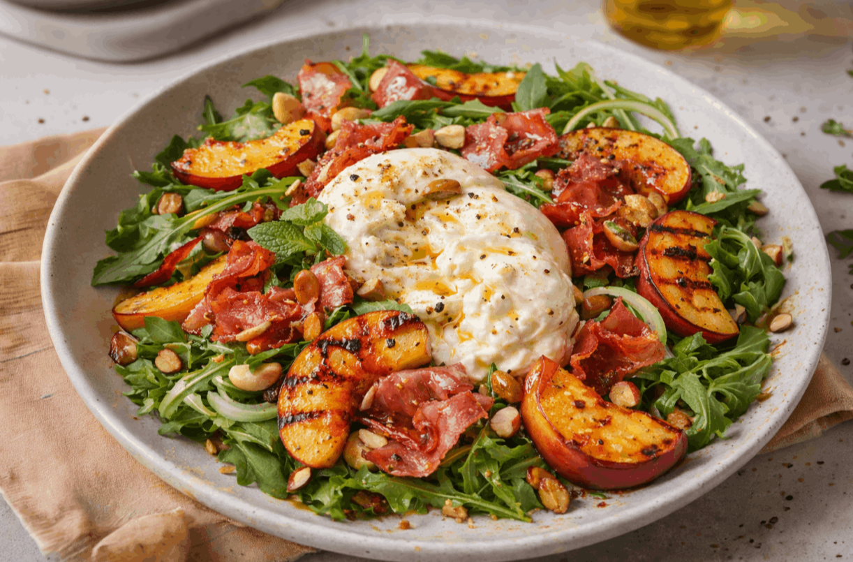 “Peaches kissed by the pan, prosciutto snapped to attention, burrata doing its best “melted ego” impression — fresh, crunchy, and just smug enough to be delicious.”