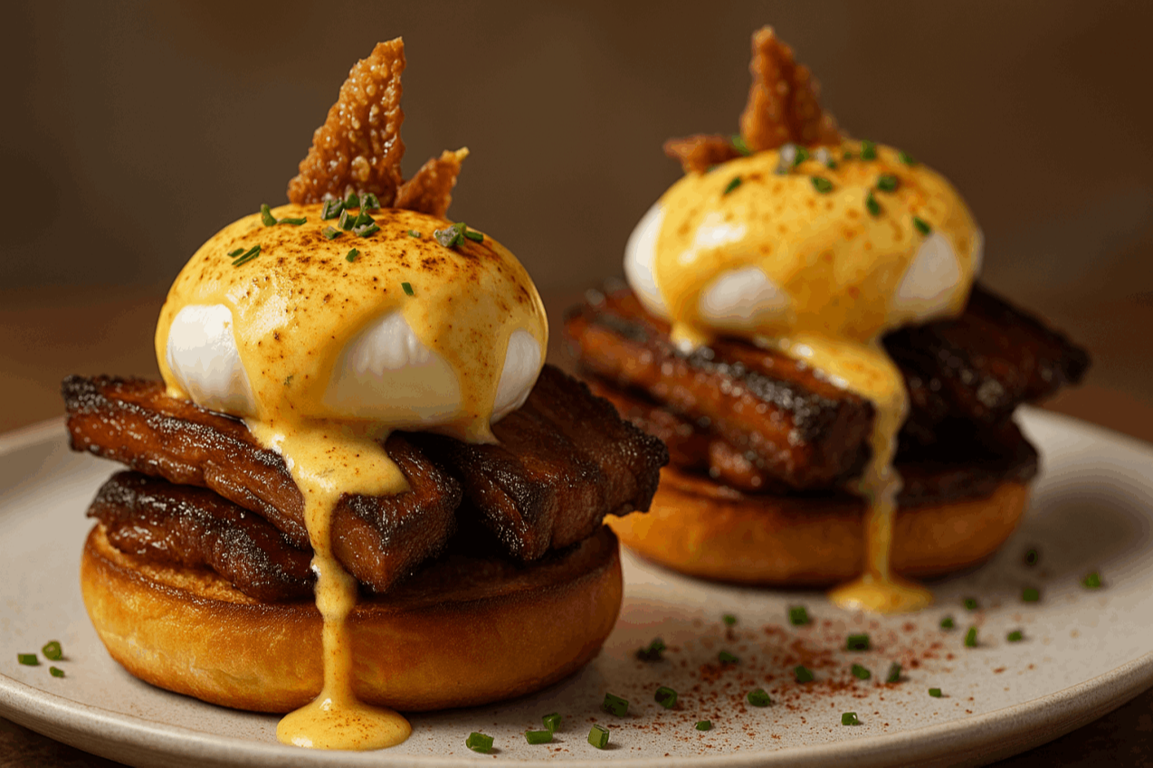 Gordon Ramswine crowns brunch with brioche, pork belly, and poached eggs drenched in smoked paprika–sage hollandaise.